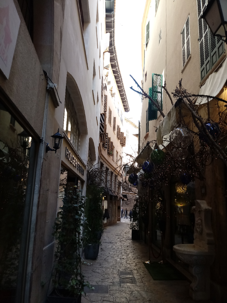 Foto del Carrer de Can Verí (antigament «d’es Verins»), de Palma, feta el gener de 2018. A l’enfront es pot veure la cantonada del’església parroquial de Sant Nicolau. En una d’aquestes cases vivia la família Vallbona-Terrassa en el s. XVIII